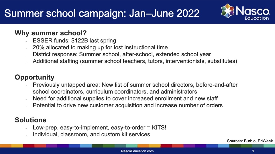 Although Nasco Education has served the K–12 supplemental materials market for over 80 years, they had never before focused on schools’ need for summer school materials.